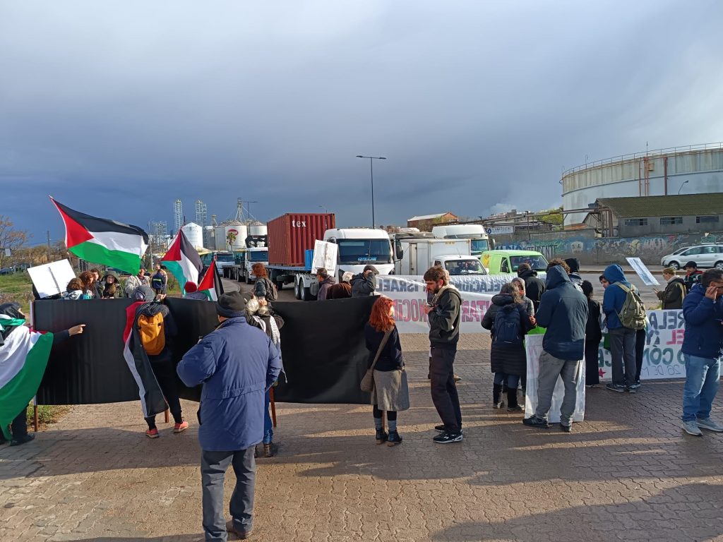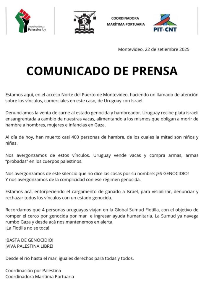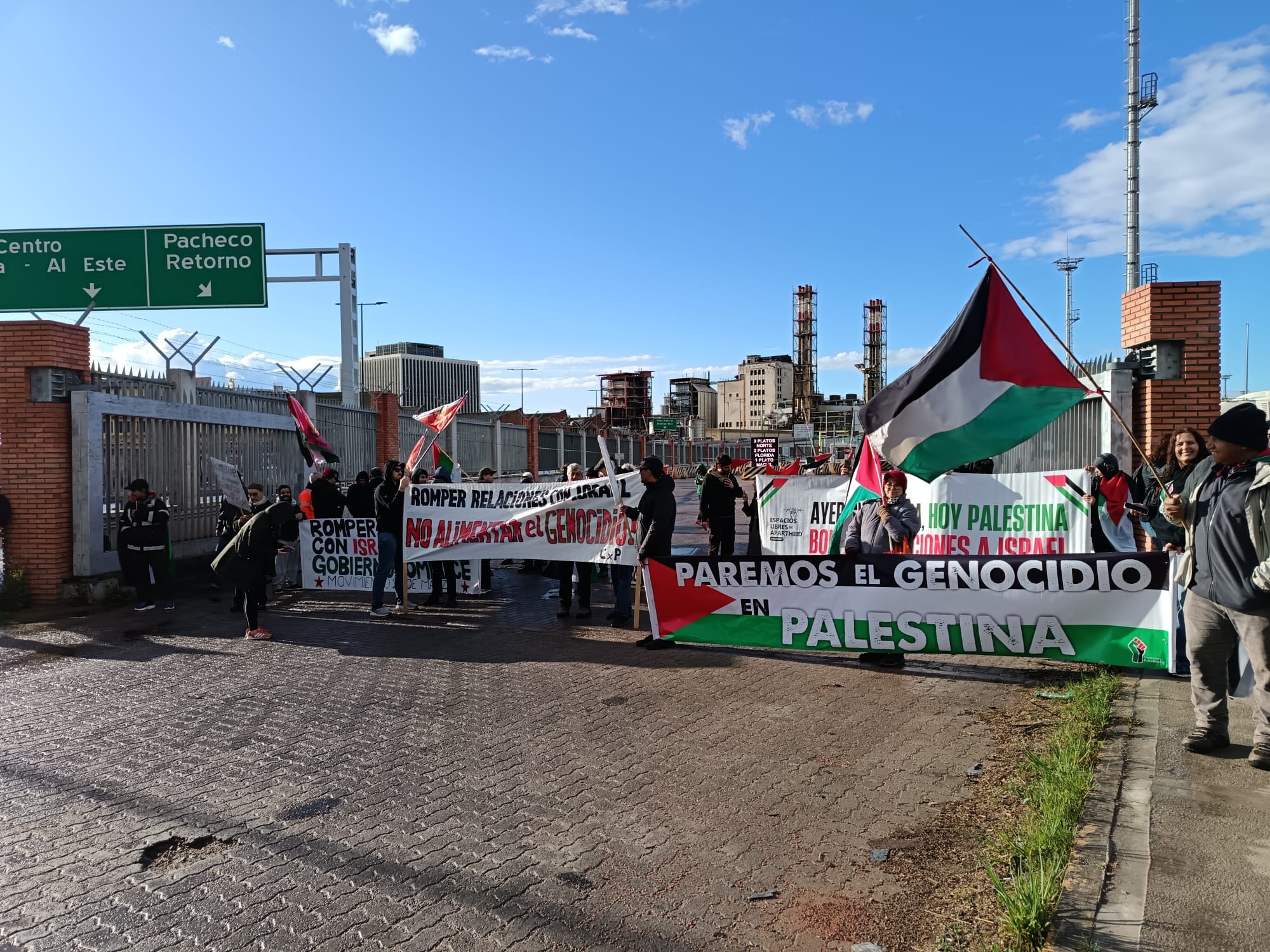 Se desarrolló esta mañana una manifestación en solidaridad con el pueblo palestino. Integrantes de la Coordinación por Palestina-Uruguay y de la Coordinadora Marítimas Portuaria, buscan detener el embarque de carne producida en Uruguay y que Israel compró para alimentar a sus tropas.