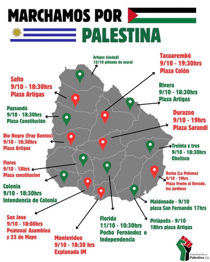 Convocada desde la Coordinación por Palestina-Uruguay se realizarán en varias ciudades del país actividades en solidaridad con Palestina, reclamando el fin del genocidio que lleva adelante Israel desde el 7 de octubre del 2023 y reiterando la exigencia al gobierno de Orsi y Lubetkin la ruptura de relaciones con los agresores .
