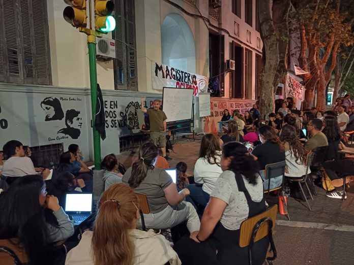 Los docentes acompañan la medida y actualmente dictan clases en las puerta del centro de estudio de la calle Soriano esquina Carnelli.