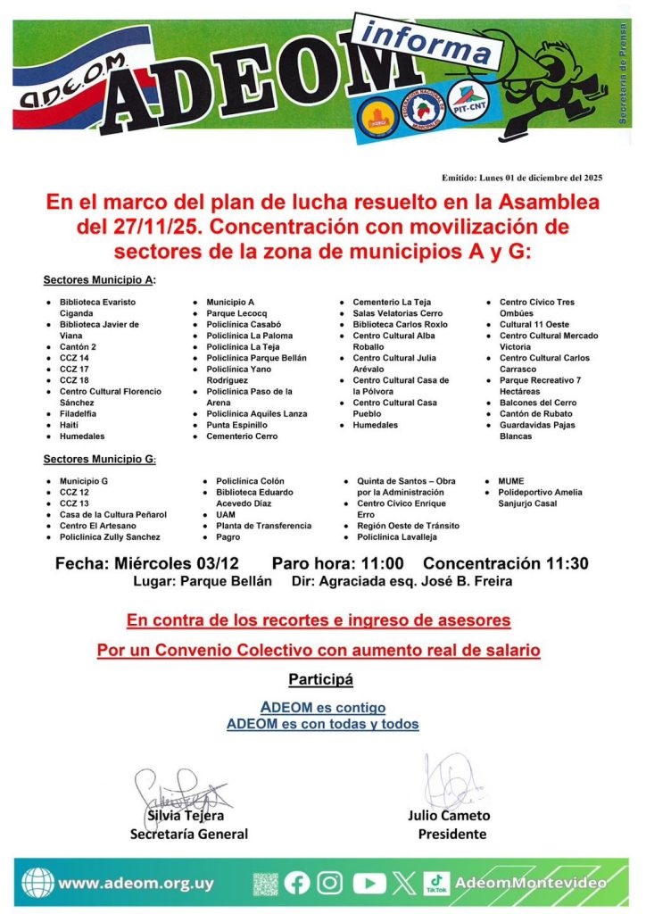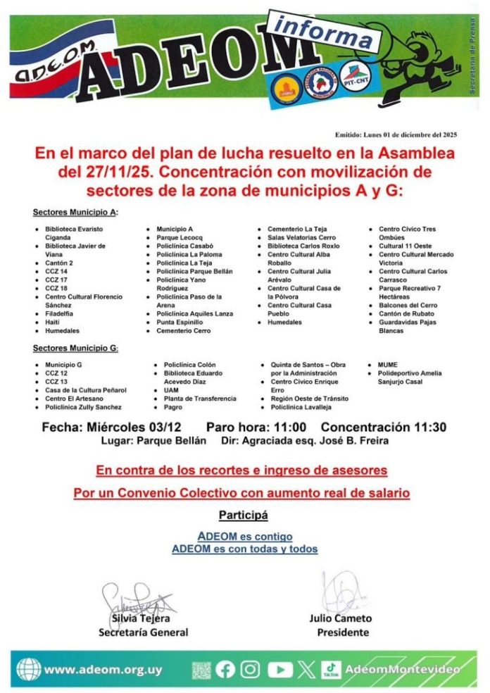 El sindicato de trabajadores municipales de Montevideo, Adeom, realizará un paro con movilización mañana “contra los recortes y el ingreso de asesores.