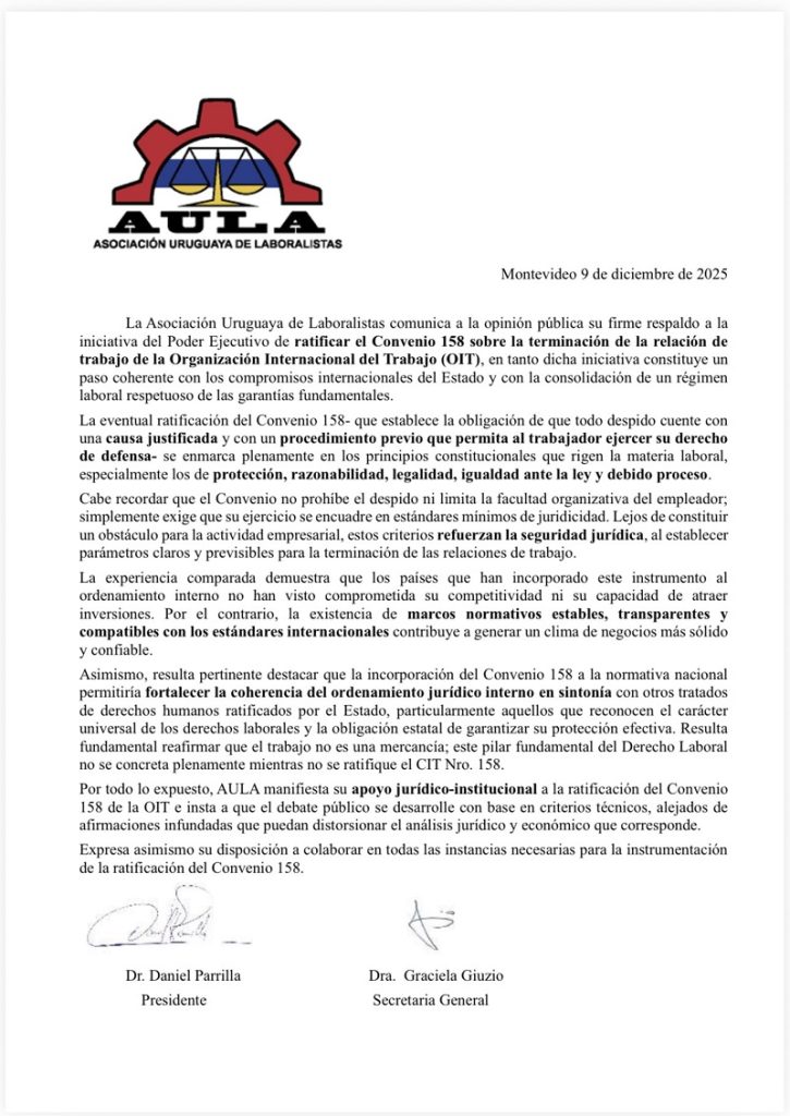Con la firma de los Doctores Daniel Parrilla y Graciela Giuzio, Presidente y Secretaria General respectivamente de la Asociación Uruguaya de Laboralistas –AULA- dicha organización hizo público un comunicado en que señalan su firme respaldo a la iniciativa del Poder Ejecutivo de ratificar el Convenio 158 sobre la terminación de la relación de trabajo de la Organización Internacional del Trabajo (OIT), en tanto dicha iniciativa constituye un paso coherente con los compromisos del Estado y con la consolidación de un régimen laboral respetuoso de las garantías fundamentales.