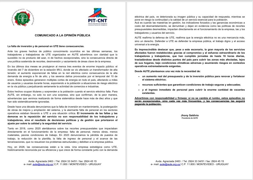 Desde el sindicato de trabajadores de UTE afirman que desde hace una década denunciaron que la falta de inversión en mantenimiento, la postergación de obras de mejora y ampliación del sistema, y la alarmante falta de personal en los sectores operativos estaban llevando a UTE a una situación crítica.