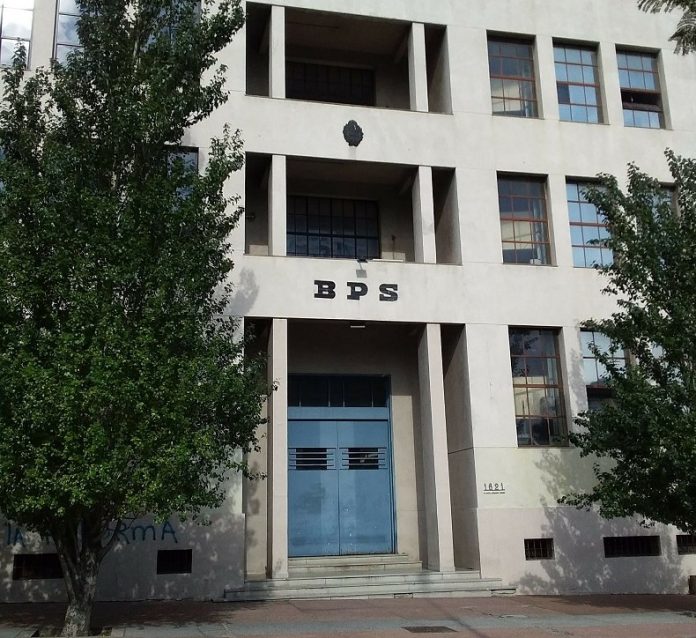 Edificio central del BPS, Montevideo, entrada de Av.Fernández Crespo/LJ.