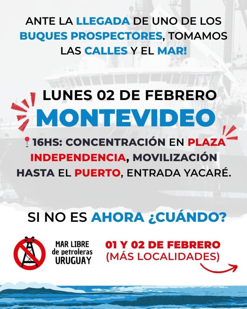 Este domingo 1° de febrero y mañana lunes la Asamblea por un Mar Libre de petroleras Uruguay está convocando a moviizaciones en distintos puntos del país, ante el inicio de las prospecciones sísmicas que apuntan a la búsqueda depetróleo en el fondo marino que pertenece a nuestro país en el océano Atlántico.