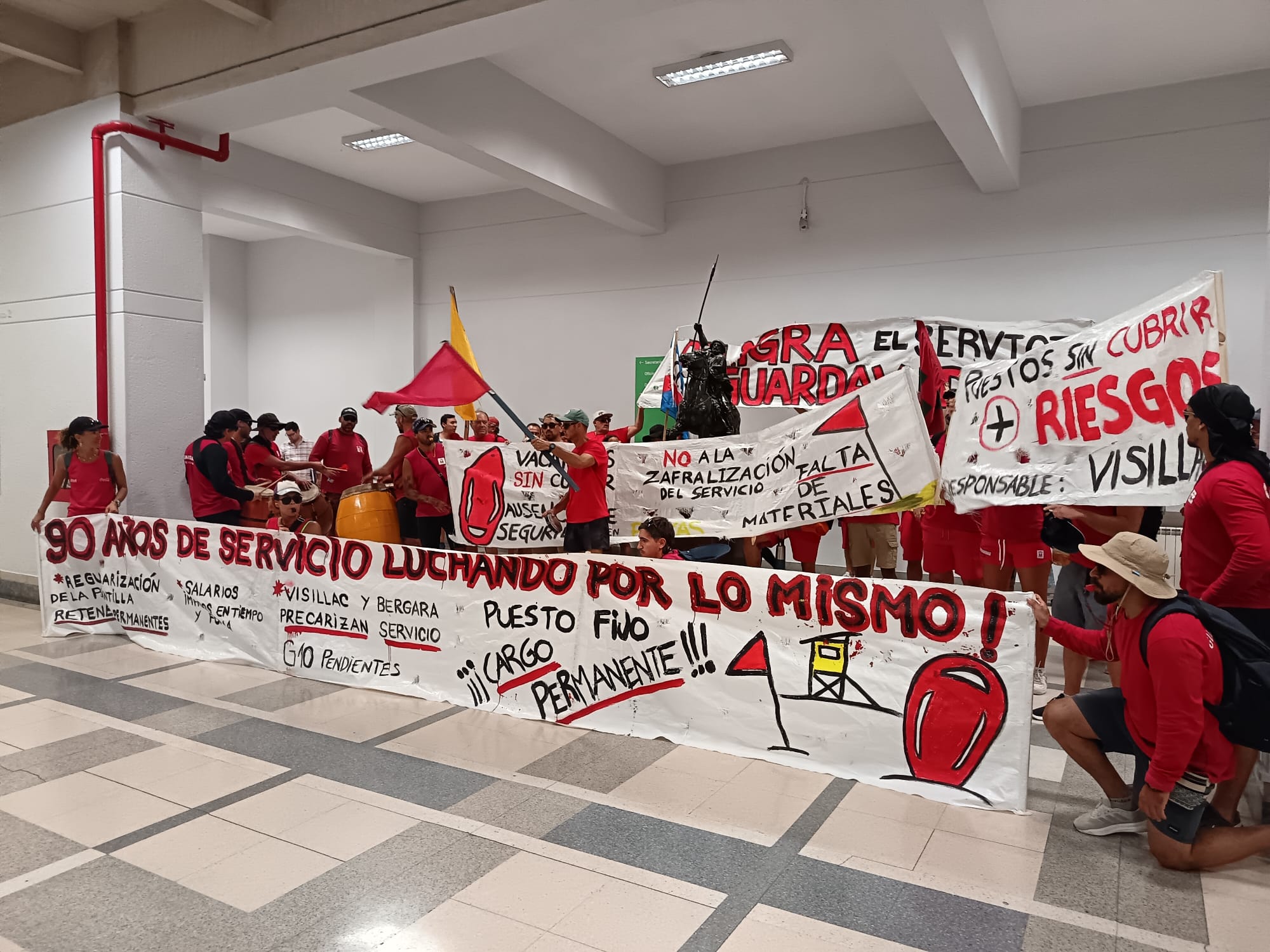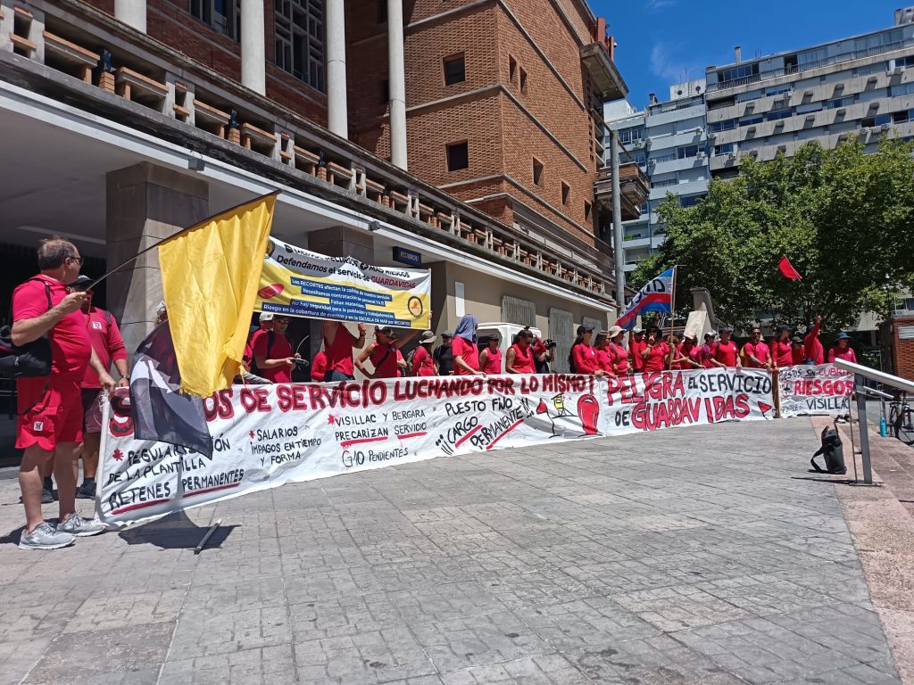 El comité de base del Sindicato de Guardavidas de Montevideo, perteneciente a ADEOM, se movilizó este viernes en la explanada de la Intendencia de Montevideo, durante una reunión que mantuvo el gremio con autoridades. Minutos antes de finalizar la reunión, los trabajadores ingresaron al edificio y se dirigieron a la puerta de la Secretaría General con tambores y silbatos.