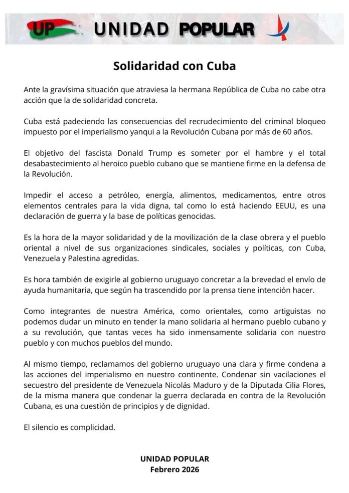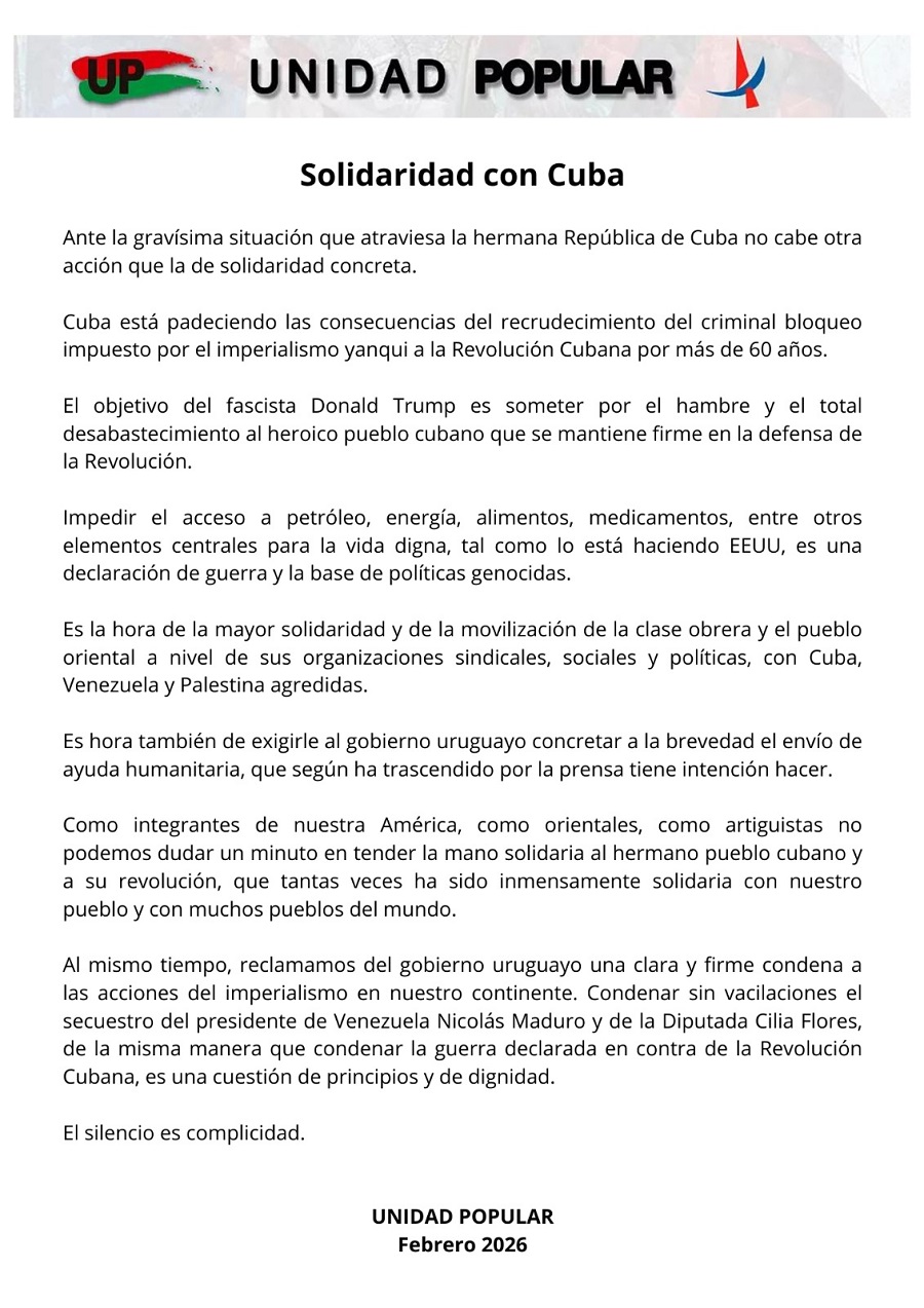 Es la hora de la mayor solidaridad y de la movilización de la clase obrera y el pueblo oriental a nivel de sus organizaciones sindicales , sociales y polìticas con Cuba, Venezuela y Palestina agredidas, se afirma en la decclaraciòn.